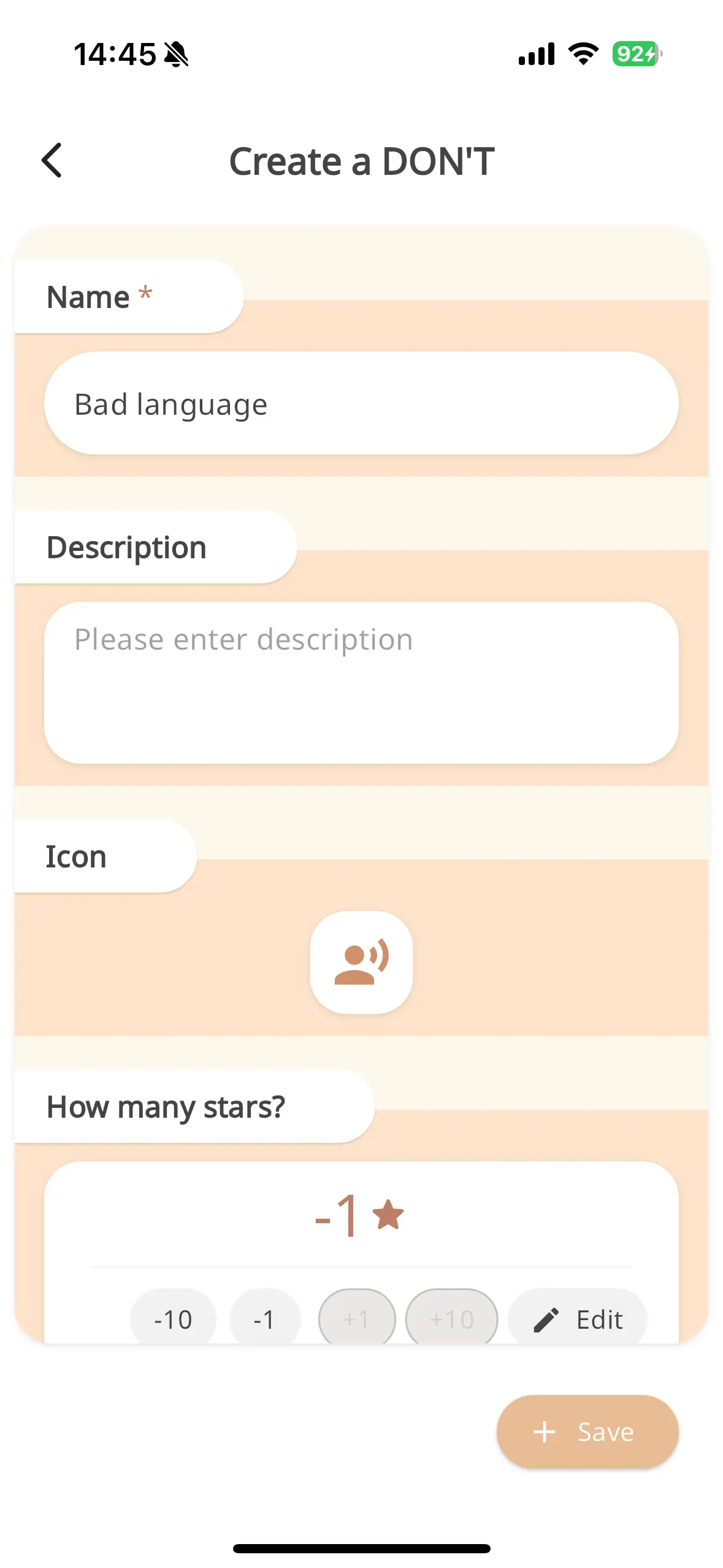 At the same time, you can also set some "don't do" things, such as "Bad language". Whenever a child does these things, you can deduct the corresponding points according to the rules.